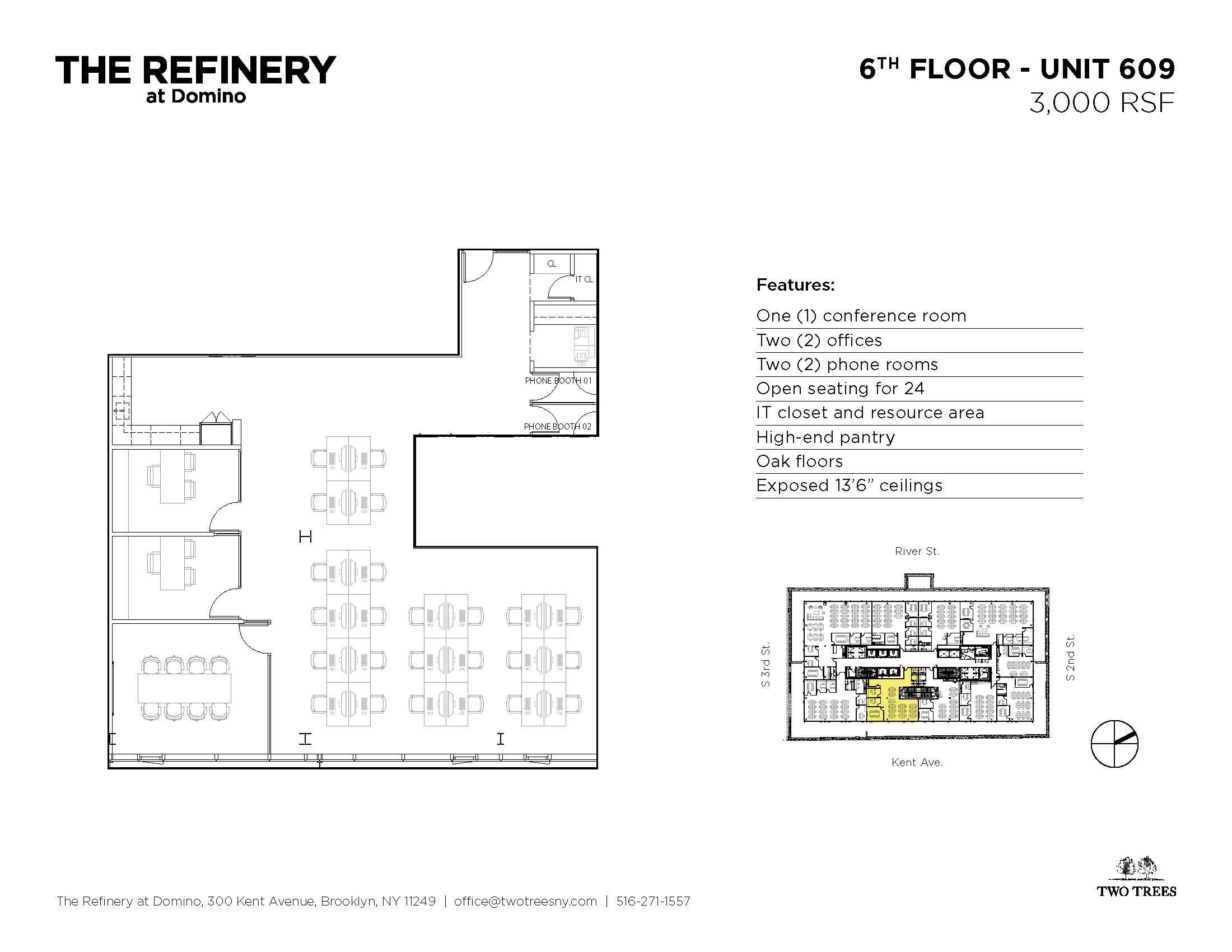 Suite 609 is built with two (2) private offices and one (1) conference room. There are also two (2) phone booth rooms conveniently built within the space. There is a high-end pantry and open seating area for around 25 employees. Glass fronts on all rooms and hardwood floors throughout.
